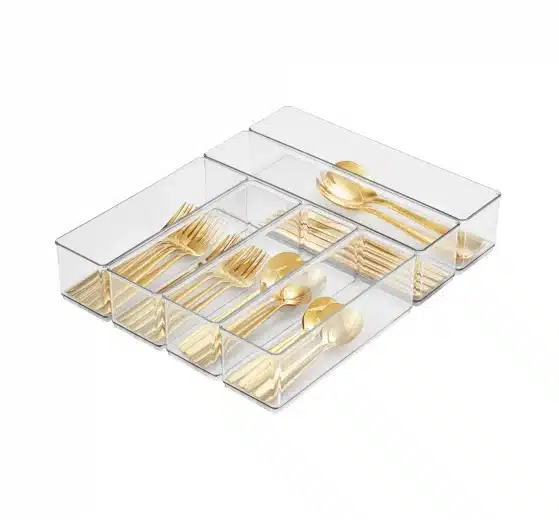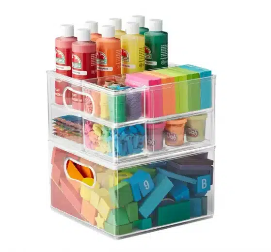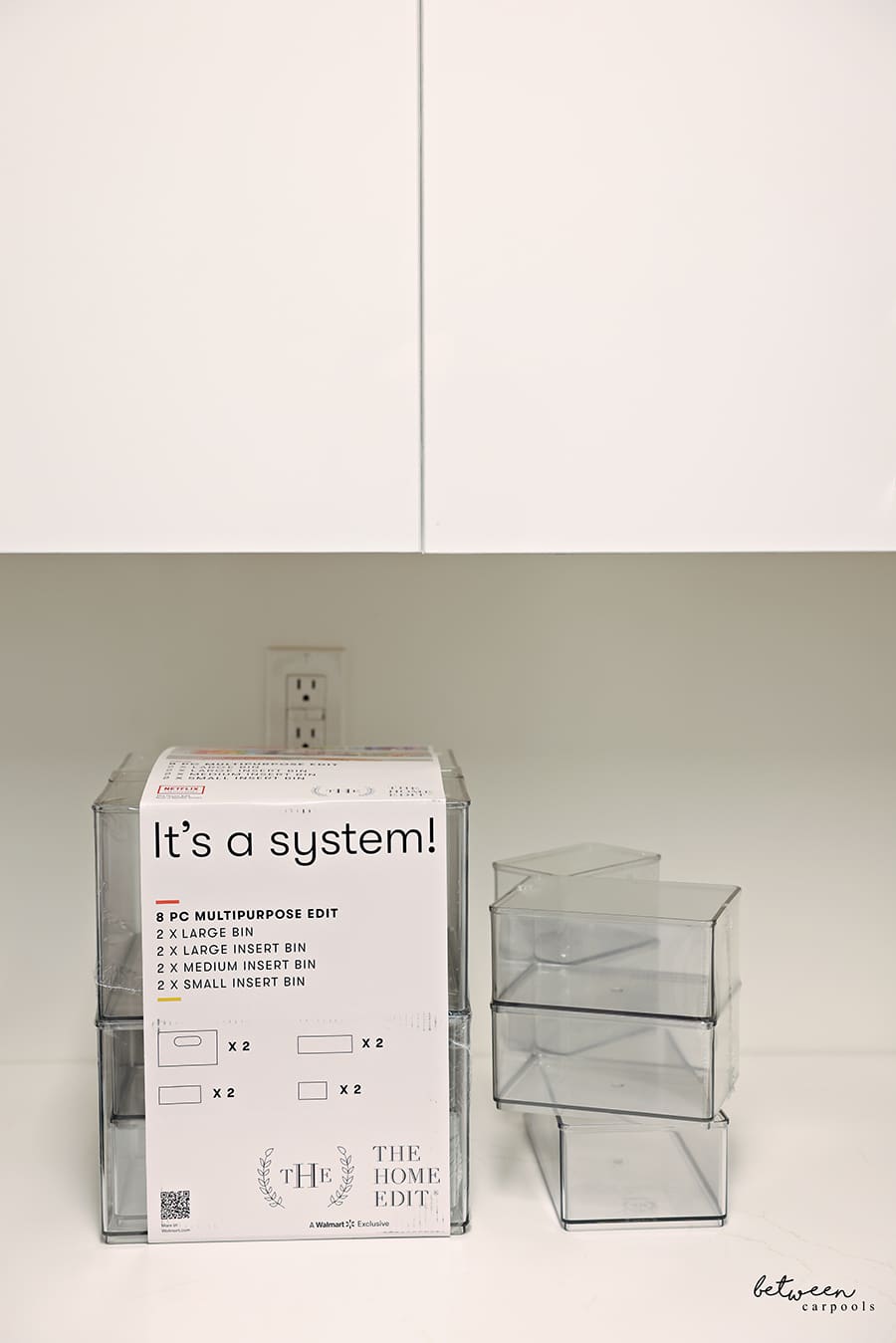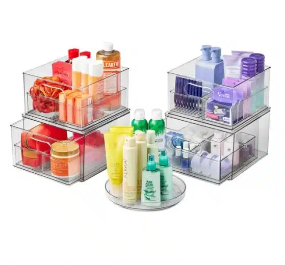 The sets include different size mini bins that go inside the bigger ones to keep things contained.