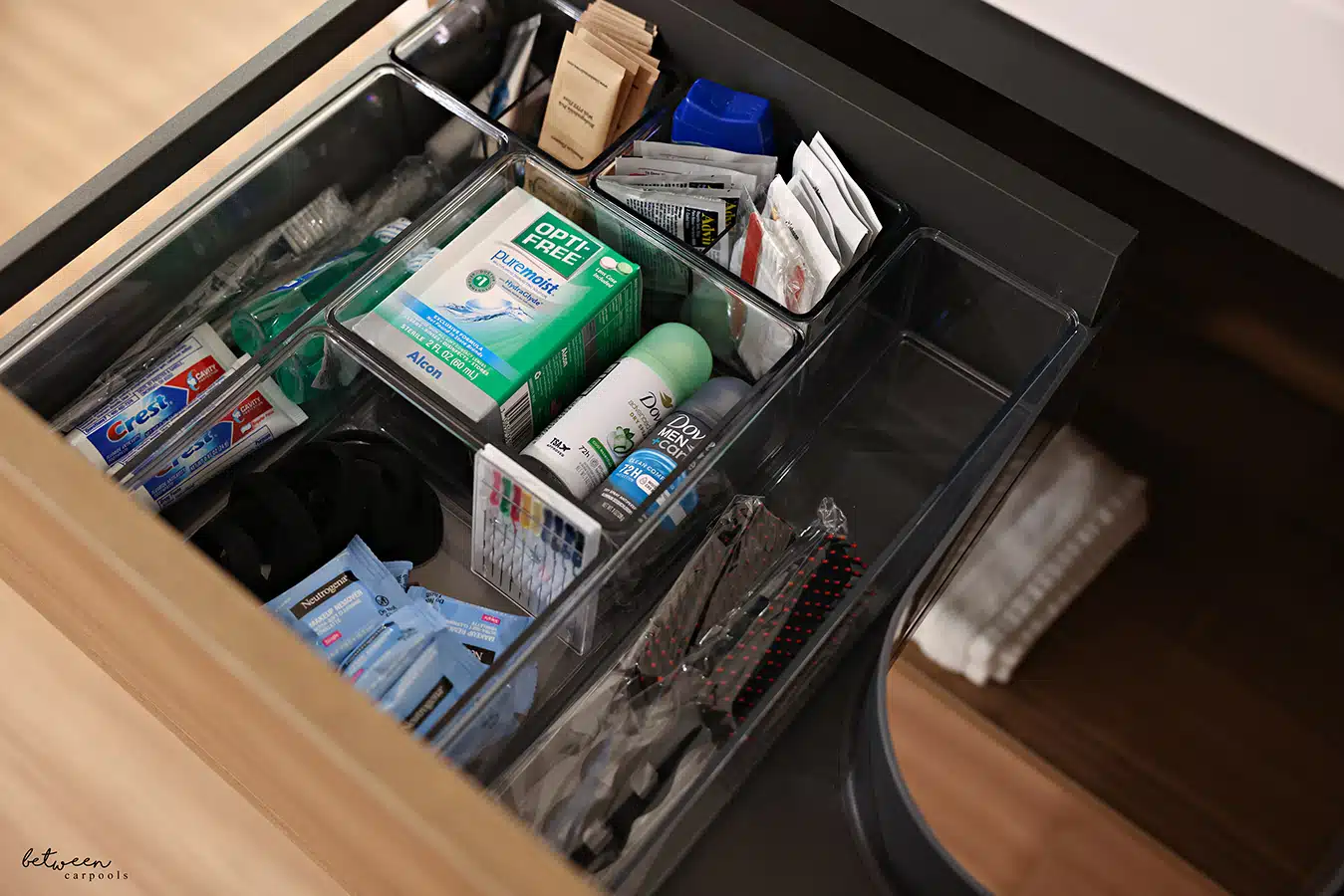 And that wasn’t the end of my storage bin obsession. I decided to order two different sets of the smaller bins – the kitchen drawer combo and the desk drawer combo so I could set up my guest bath vanities. There’s also a bathroom combo but I didn’t try that one. All the different sizes coordinate and come together to perfectly fit the space in the vanities (which are not the same size). I love how appealing and welcoming those drawers look now!