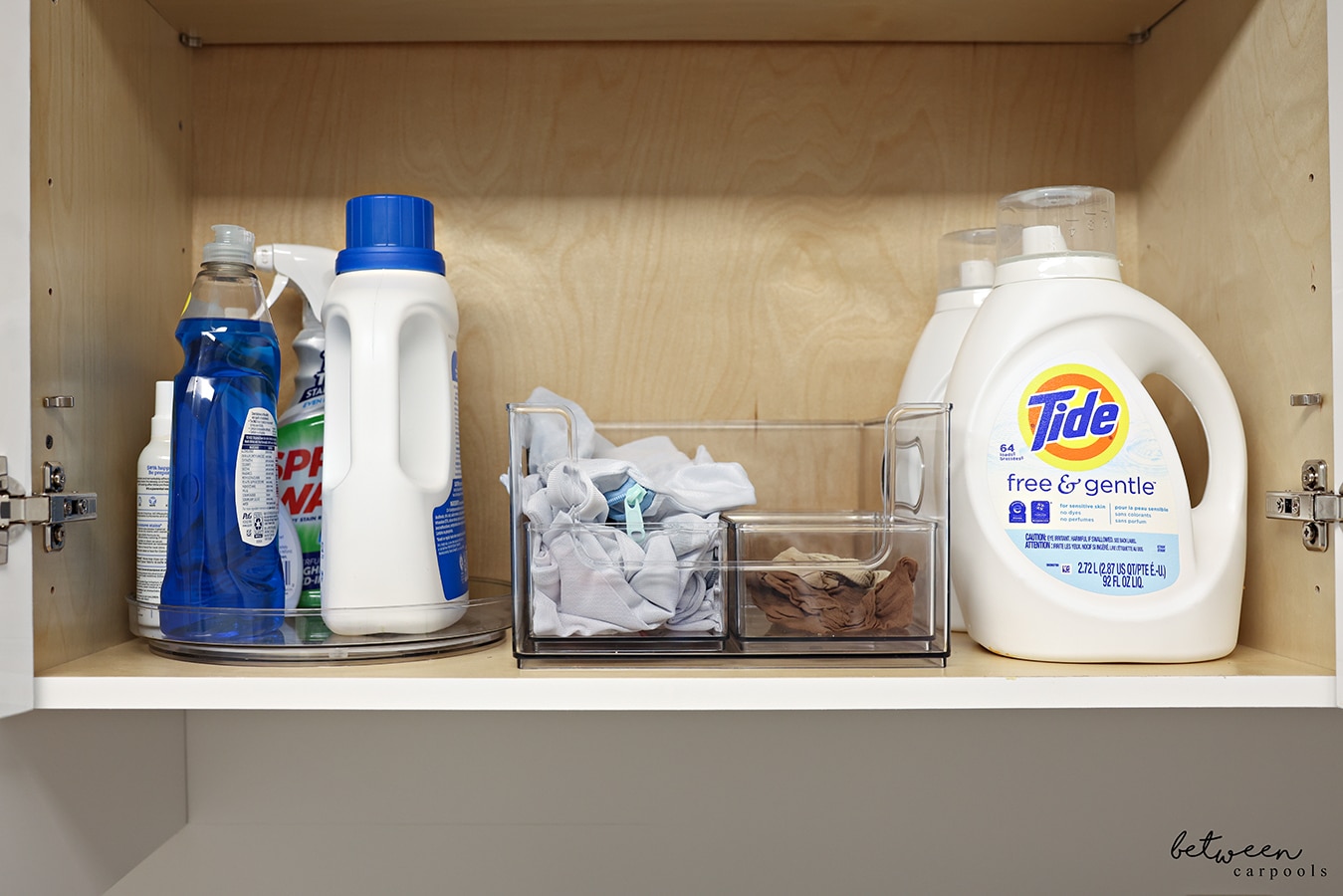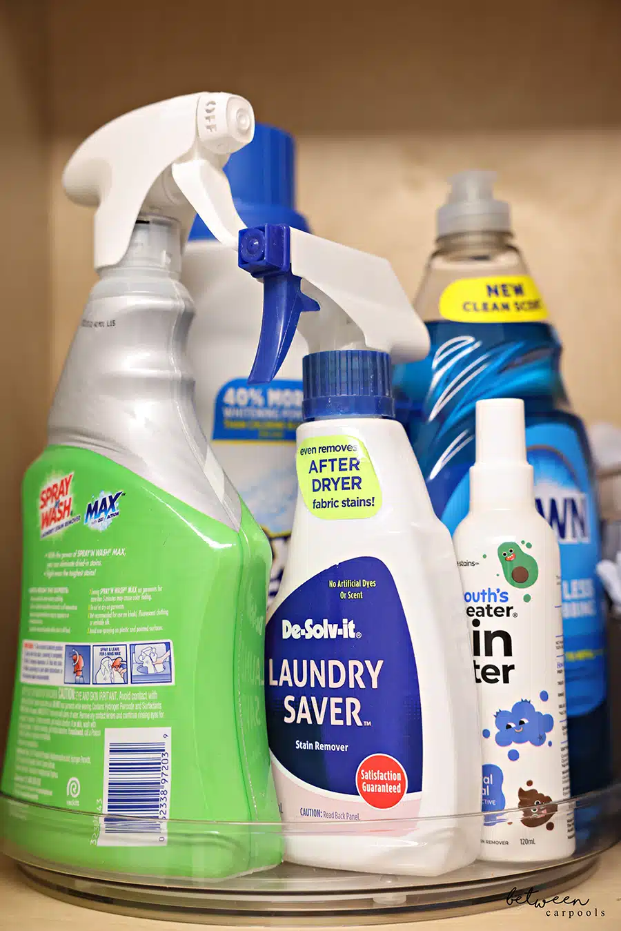 The lazy susan keeps stain removers and other laundry bottles easy to reach above the washing machine.