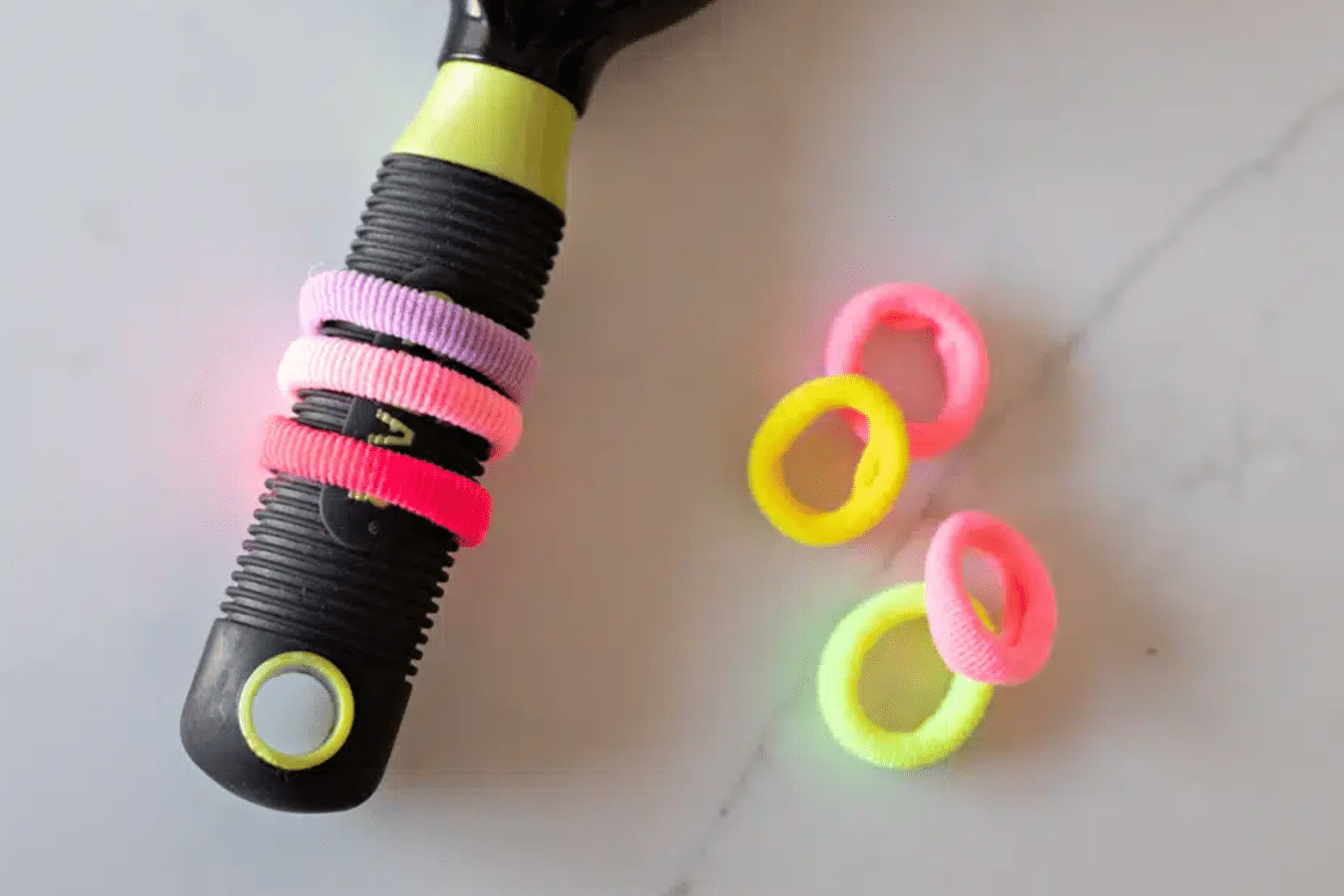 If you don’t have space for a setup like this in your kitchen, simply wrap a bunch of ponytail holders around the handle of a brush for a more efficient portable hairstyling “center.”
