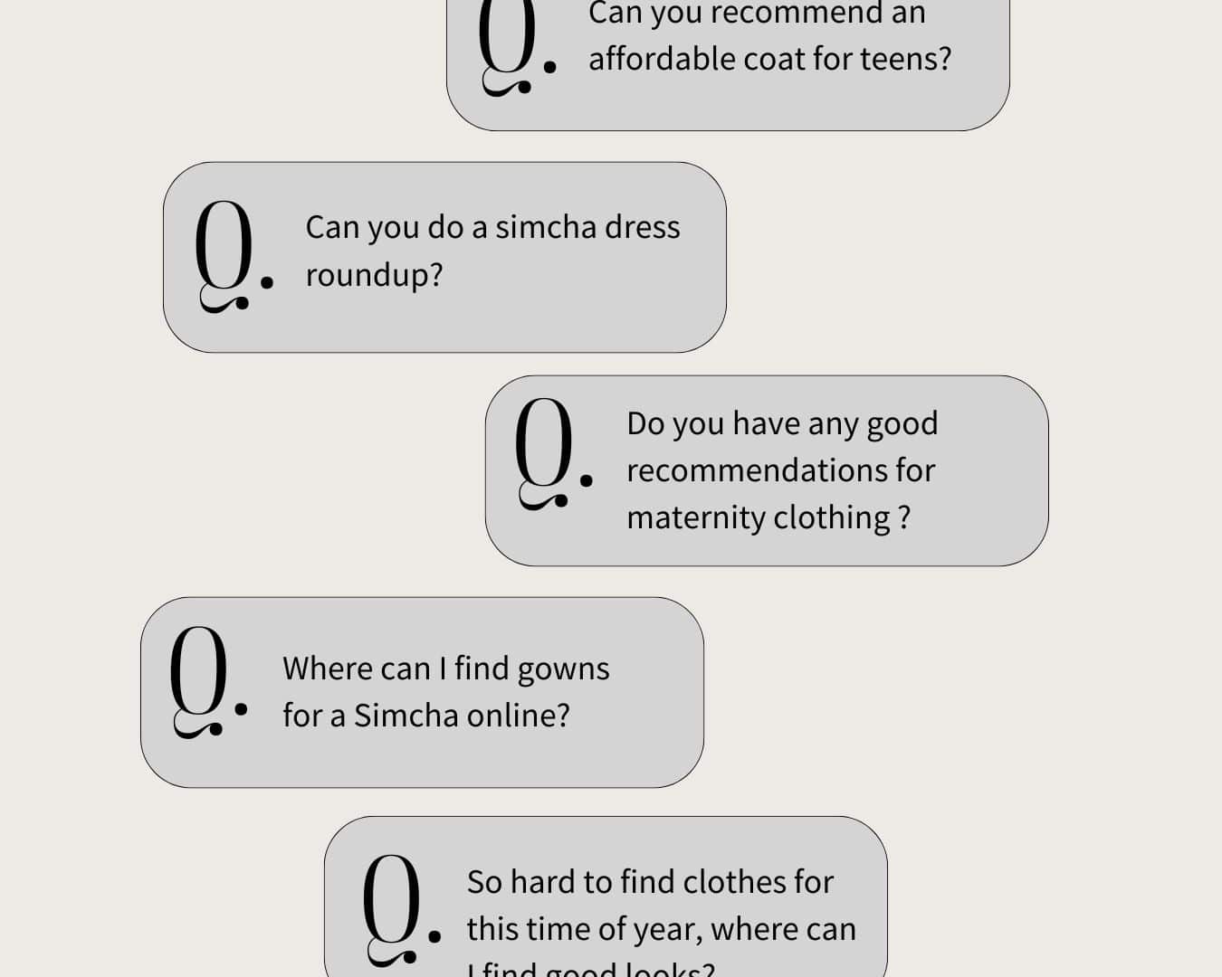 “Can you recommend an affordable coat for teens…can you give recommendations for good maternity clothing for Yom Tov…can you do a simcha dress roundup?”
