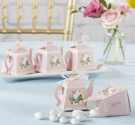 The green moss teacups housed the centerpiece florals. Thanks to Willow and Rose Florals for filling them up! She’s so talented and really understood my vision, arriving with extra florals for my daughter’s hair. The matching purse planters were on the dessert table, and these teapot favor boxes completed each table setting.