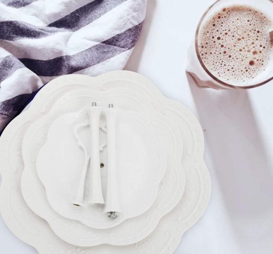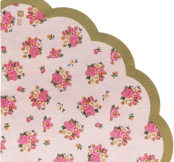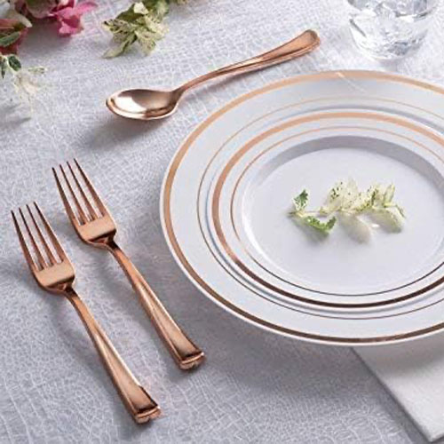 Equally charming are the scalloped napkins alongside them (paired with rose gold disposable flatware).