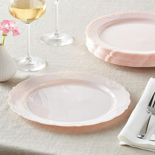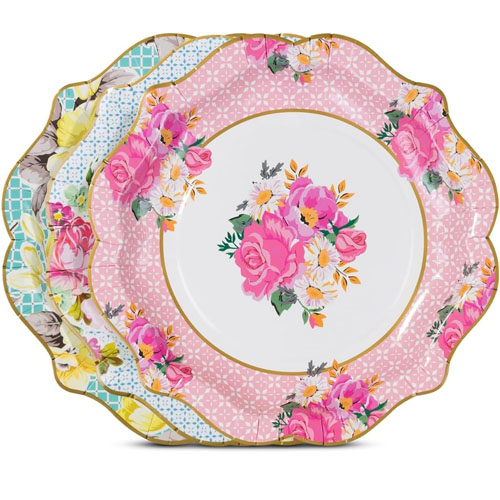 Plates aren’t just for holding the food. Those vintage-style floral plates on the tables are…yup, paper. You can get them here. I used them as accent plates paired with these pink plastic disposable dinner plates.