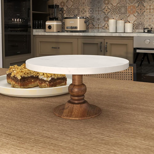 The stunning centerpiece cake, made by Queen of Tart, sat on this marble and wood cake plate.
