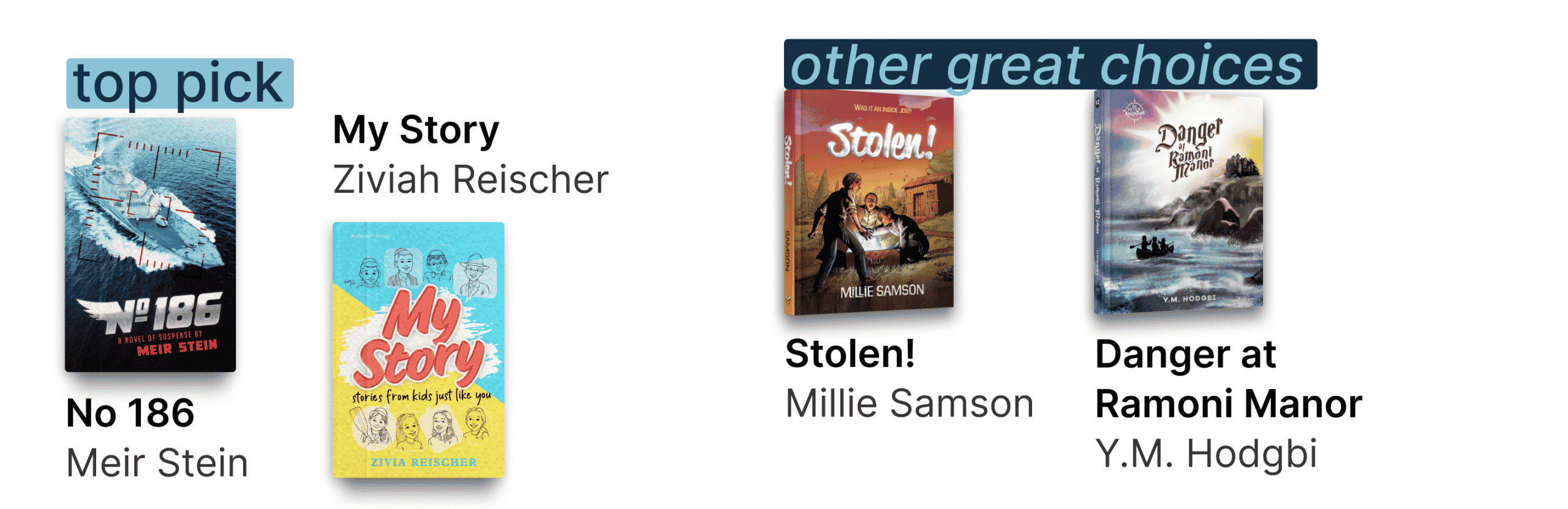 No 186 You can purchase here. by Meir Stein – frum boys unwittingly get roped into a wild, imaginary, and fantastical mission in the middle of the Mediterranean Sea