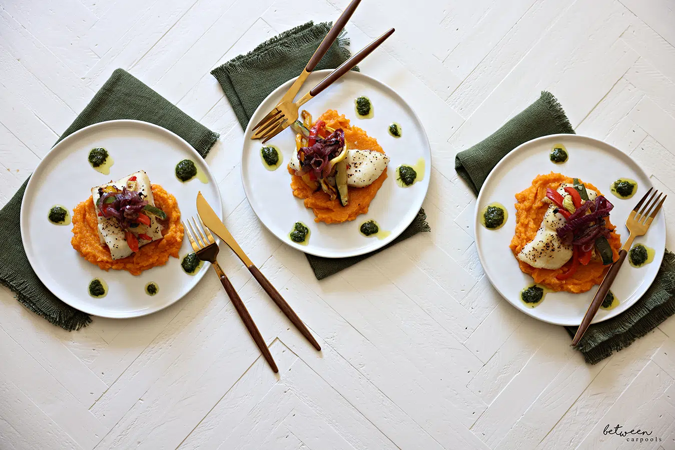 - Plate the dish. Swirl sweet potatoes on your plate. Top with fish, then veggies. Dot plate with some pesto.