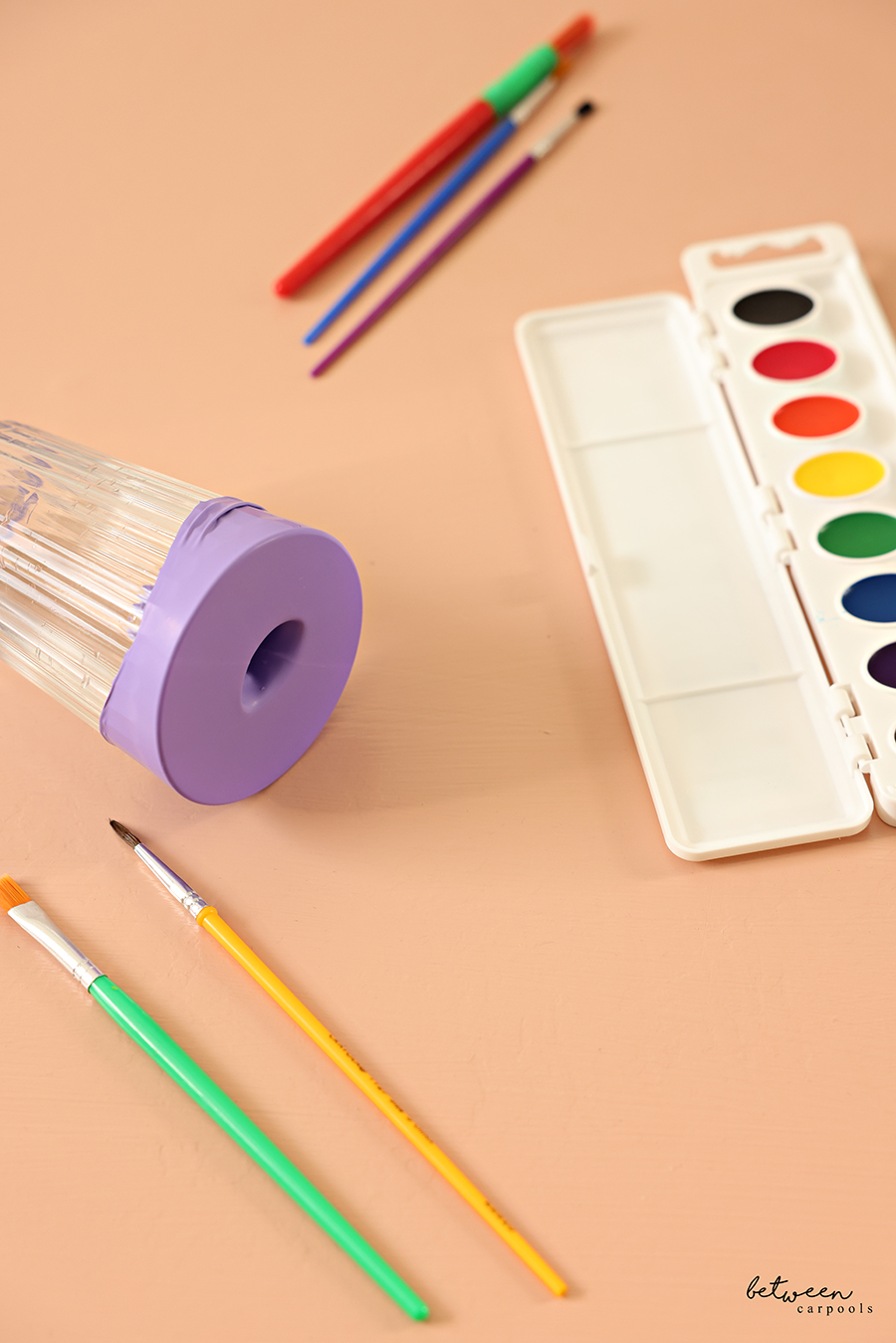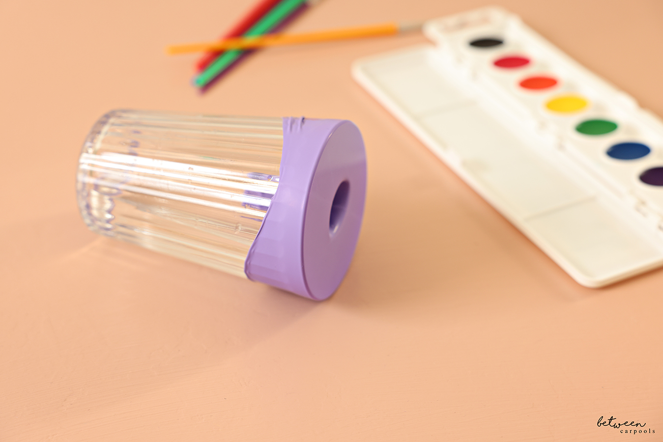The problem here is that cup of water. The one that always turns into different colors pretty quickly. It inevitably gets knocked off, drenching everything.