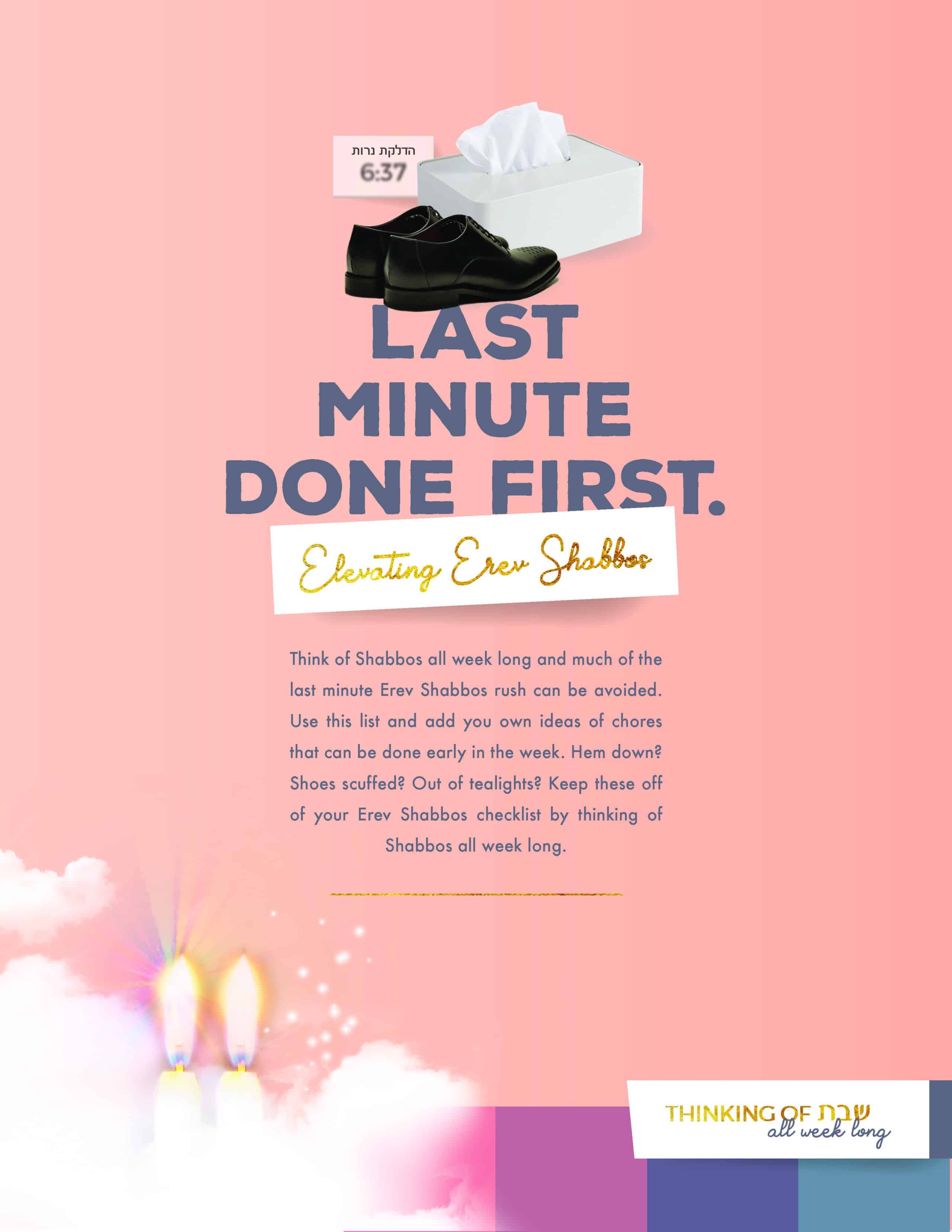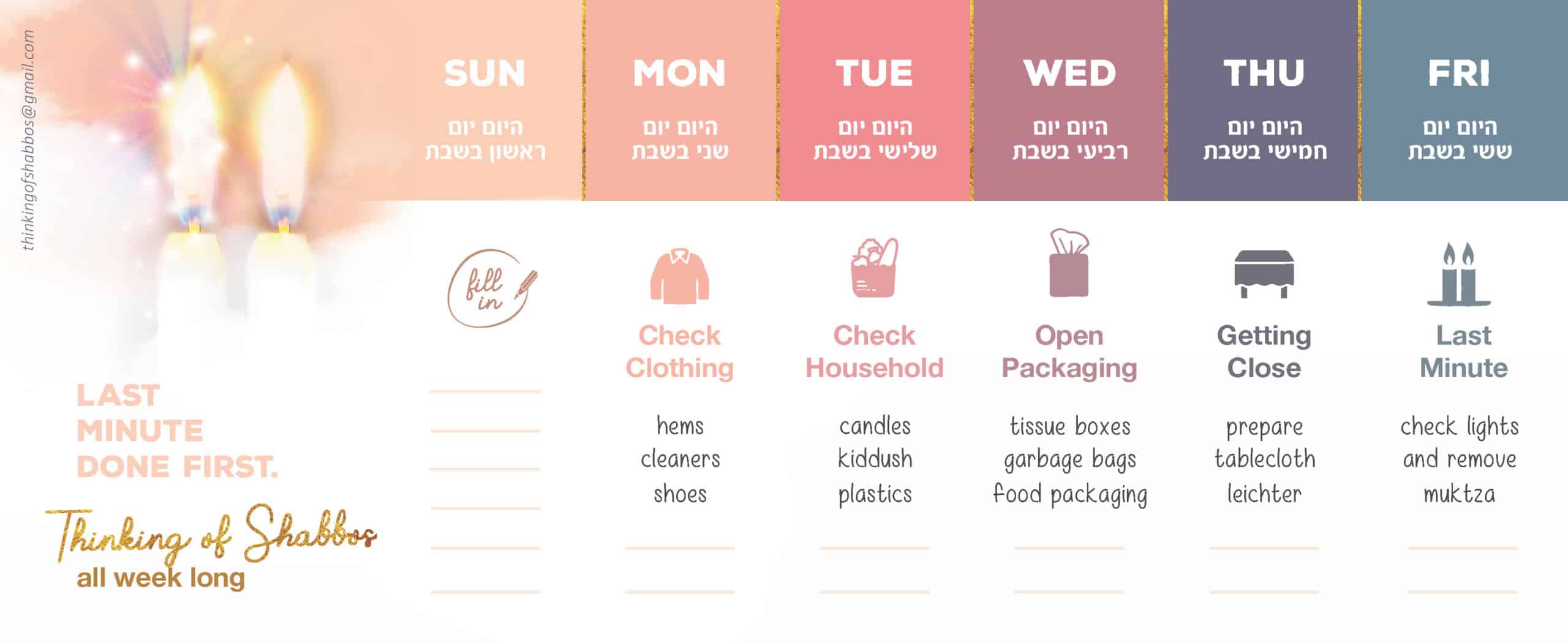 While dreading the crunch of trying to check off all the items on my Erev Shabbos to-do list, an idea was born. There had to be a better way. And plus, we all have a chiyuv to count towards Shabbos every day. I always had a dream to design something that will help, and after pushing it off for too long, here it finally is.