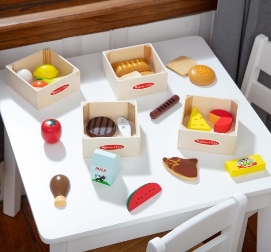 The food sets from Learning Resources are a bit more pricey than the Melissa and Doug sets but are worth the price, as they are very realistic looking and made of a rubberized plastic that will never tear or break! And they come in small sets that make it easy to grow your collection slowly