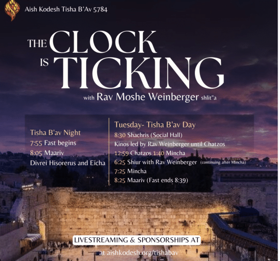 Call Chazak at 718 258 2008 for inspiring shiurim about the three weeks and tisha b’av. To hear personal stories about the Holocaust, press 9 and then 3.