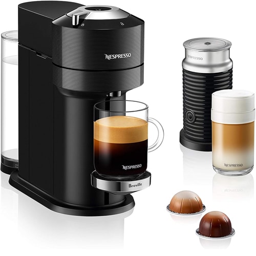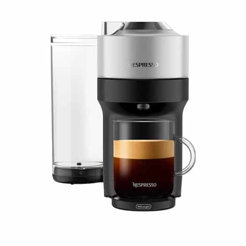 The Vertuo Next machine is the lowest priced machine that brews the newer larger size pods, including carafe size. Keep in mind that it has a smaller water reservoir than most. It’s also the narrowest machine. Make sure to check the dimensions of any machine you plan to order to make sure it fits in the space you plan to use it. The Vertuo Pop is cool looking and also very compact. The water reservoir is the smallest of all, but it’s easily removable for filling. The Lattissima machine mentioned above is also available in a Vertuo version.