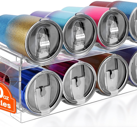 Finally, water bottles are really most practical when you have a convenient place to store them. This Water Bottle Organizer keeps them neat, so you can easily grab the one that suits your needs today.Β This organizer is not as aesthetic, but holds more of the large 40oz water bottles than the wooden one.