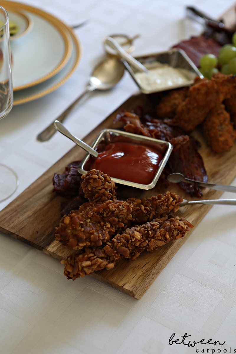 ** Add grapes for color and lastly, add dips! These dips came with our Chicken Crunchers (Buffalo Sauce, Creamy Ranch and Chive, and Garlic Mayo), and we added Bone Suckin’ Mustard.