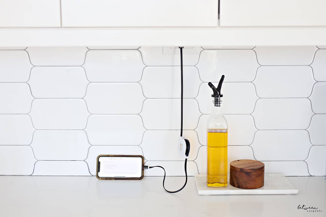 Besides my wireless 3-in-1 charger that I use every night, this is the most frequently used charging spot in the house. So we like to have lightning and usb-c charging cables plugged in almost all the time. (Yes, you need outlets with built in USB ports in 2021.) But the hanging cords when they’re not in use are so annoying to look at!