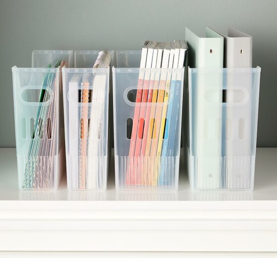 Leah Schapira has this activity book bin, recommended by organizer Shulamis Weil, if you’d like to store a larger quantity of books (this one is the X-Large but all sizes would fit activity books well, depending on how many you want to keep on hand at a time).