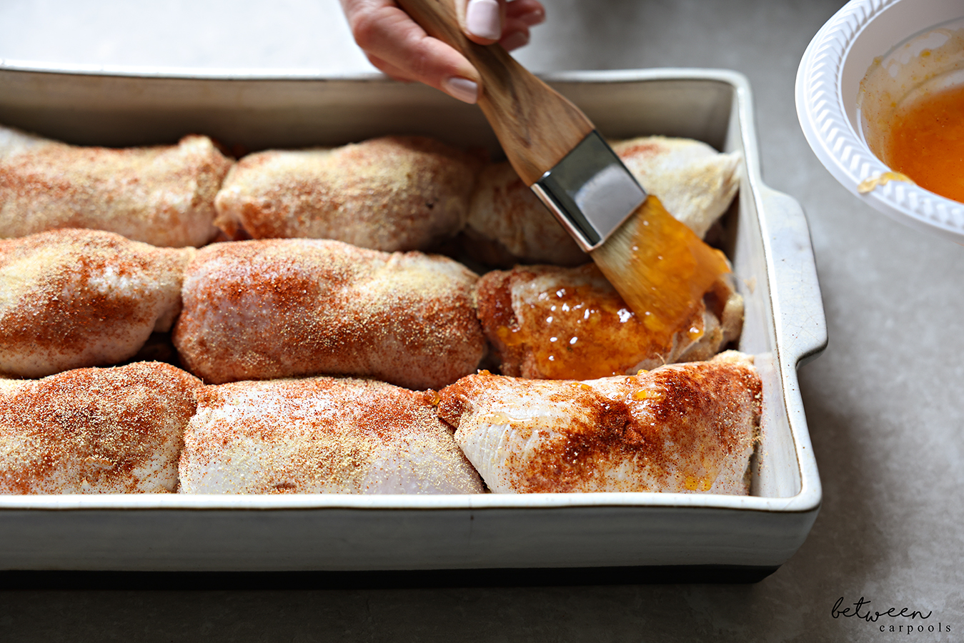 - Sprinkle chicken with garlic powder (we prefer the granulated version) and paprika. Brush with duck sauce.