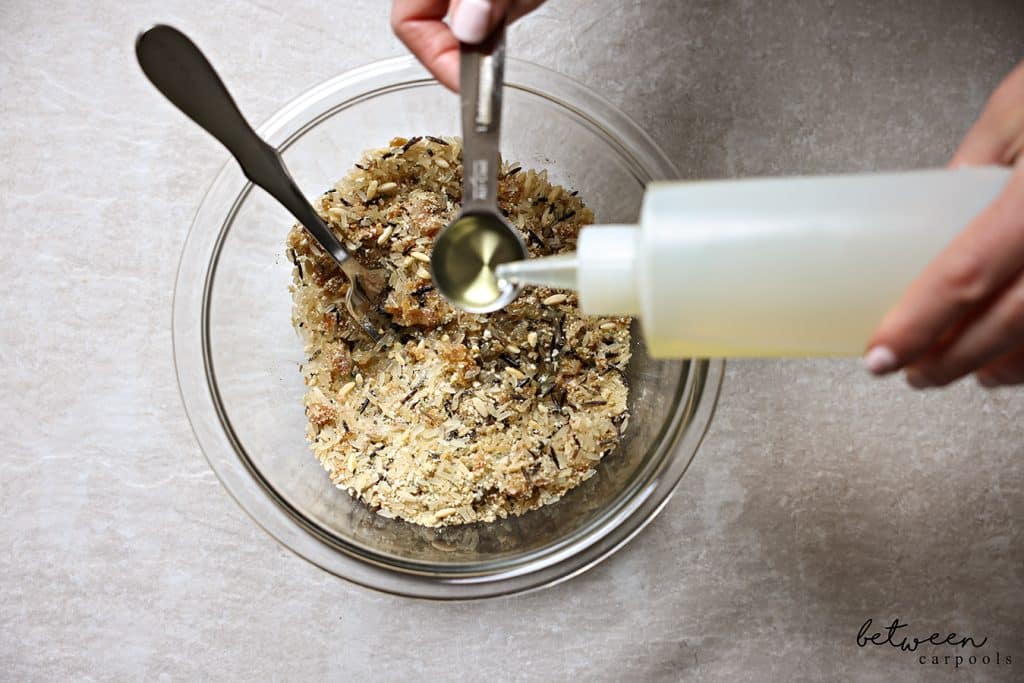 - In a small bowl, combine the Near East Rice with the included seasoning, frozen onions (or if using homemade fried onions), bread crumbs, and oil. Mix to form a filling.