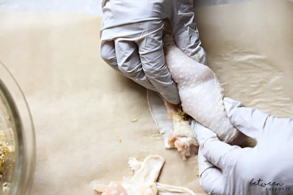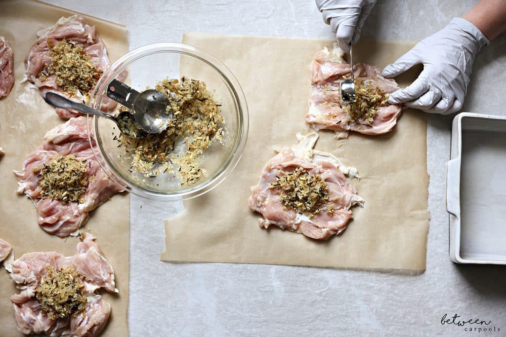 - Spread your chicken open on a piece of parchment paper, skin side down. Divide the filling between the chicken (we used 2-3 tablespoons for each one).