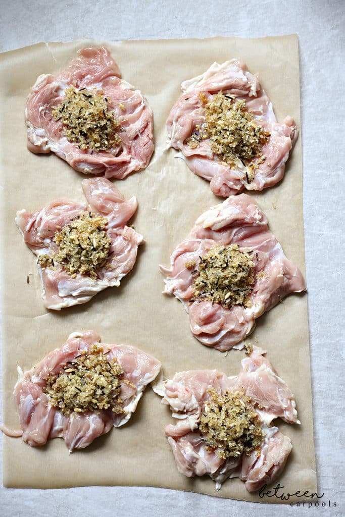 Then, spread your chicken open on a piece of parchment paper, skin side down. Divide the filling between the chicken