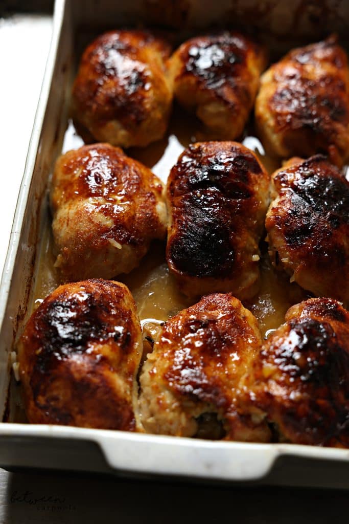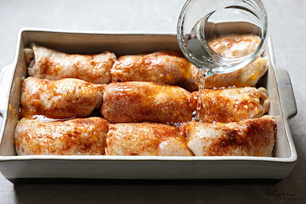 Place chicken seam side down in an oven-to-table baking dish (or a disposable if you prefer to transfer the chicken later). Place them snugly together to ensure they bake well and don’t fall apart or open up during cooking.