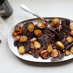 After the meat has cooked for 2 hours, add cooked potatoes to the pot. Make sure the meat is somewhat submerged in liquid and the potatoes are on top. Return pan to oven and cook uncovered for an additional hour, or until meat is fork tender (total cooking time is at least 3 hours, sometimes 3 ½ depending on your oven and the size of the beef).