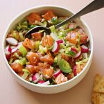 Dice the fish into small pieces. Add to a mixing bowl along with the radishes, jalapeno, leek, garlic, and spices. Start with ½ teaspoon salt and taste to see if you want more. Cover with the oil and mix. Transfer the fish to a container and refrigerate until ready to serve.