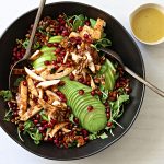 Plate the salad. Add apple and avocado. Slice the chicken into thin strips. Add to salad. Top with pomegranate seeds and pumpkin crunch. Toss with dressing (you won’t need all of it) when ready to serve.